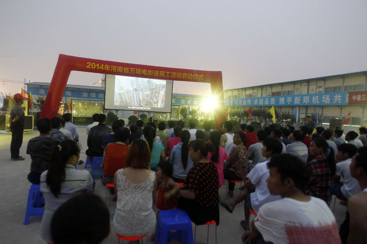 6月10日晚8時, 鄭州機(jī)場二期工程建設(shè)工地中建三局新鄭機(jī)場T2航站樓項目指揮部大院內(nèi)人聲鼎沸、歡歌陣陣,由中共河南省委宣傳部、河南省廣電局、鄭州機(jī)場二期工程建設(shè)指揮部主辦,鄭州市文化廣電新聞出版局、河南新農(nóng)村數(shù)字電影院線有限公司、鄭州商都數(shù)字電影院線有限公司、中建三局新鄭機(jī)場T2航站樓項目部承辦的2014年河南省萬場電影送民工活動啟動儀式如期舉行,300余名鄭州機(jī)場二期工程參建人員興致勃勃地觀看了河南影視制作集團(tuán)出品的《永遠(yuǎn)的焦裕祿》和《新少林寺》等影片。河南省委宣傳部常務(wù)副部長王耀;河南省新聞出版廣電局黨組副書記、副局長宋鳳仙;鄭州機(jī)場二期工程建設(shè)指揮部副指揮長、河南城際鐵路公司常務(wù)副總經(jīng)理劉光明等領(lǐng)導(dǎo)同志出席了啟動儀式。